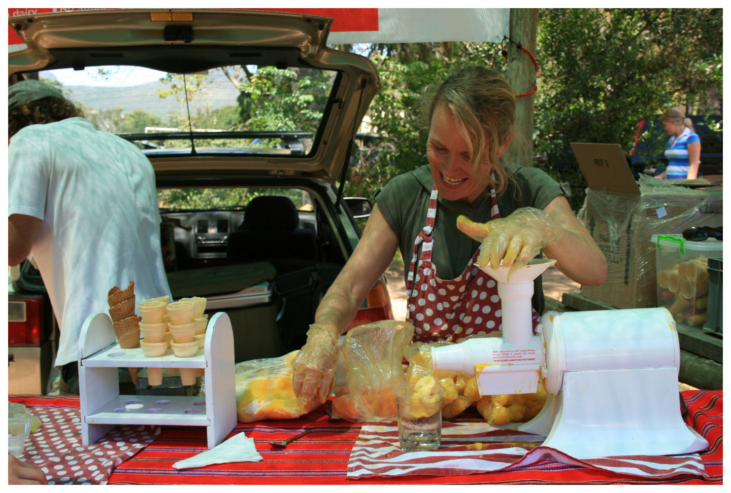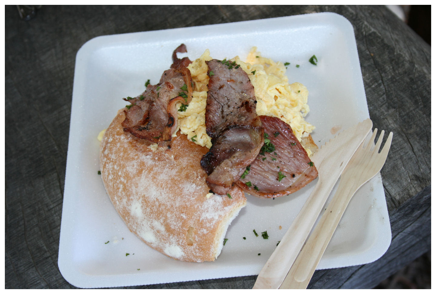 I am not a big fan of fresh produce markets...or flea markets...or anything that involves stalls and a lot of people. Needless to say I was not very keen on going to the Porter Estate Market in the Tokai forest either, but when my wife told me that they have very nice breakfasts she convinced me to go check it out. The markets basically provides the same goods that you would find in any market, and I wasn't really impressed with the bread, vegetables and the other things that you could find everywhere else. There were however some things that caught my attention, like the homemade ginger beer and the fresh fruit ice cream smoothies. And then of course the breakfast stall. Like a typical stall you would find in a setting like this, it was rather "rugged", and I was thinking that the way it was going to be served would be in the same fashion. I was totally correct. However, the smell of the bacon on the open fire was good enough to make you want to eat it with your hands, so the polystyrene plates and wooden utensils didn't put me off at all. Eating everything with your hands under a Yellowwood tree just added to the experience. ![]() |