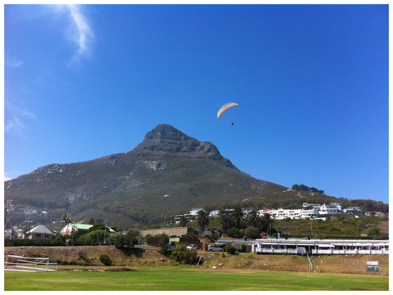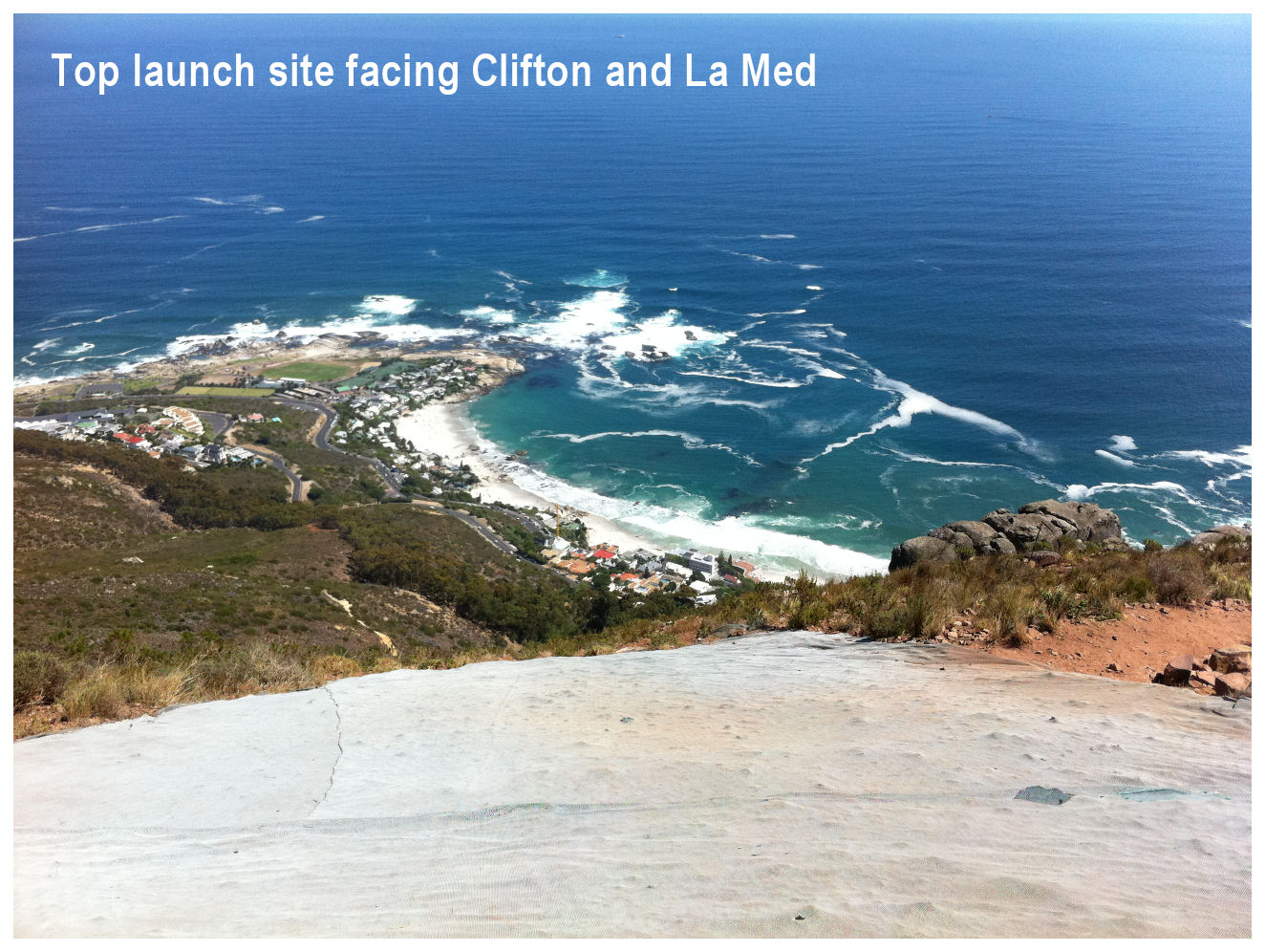 There are two take-off / launch sites at Lion's head. One facing Camps Bay and the other facing Clifton Beach. Both are very short launches. The first one you have to deal with a bunch of trees that sits like hungry Venus Fly Traps waiting for their prey, and the second one has a sharp drop that lands you back on the footpath...or on some hiker's head. The official landing area is a small grass patch in front of La Med, where the view is great, the girls are hot and the drinks are friggen expensive. There are other less favourable places to land if you sink out too fast or if the wind blows you off course...like Camps Bay (get fined by police) or the sports field of Camps Bay High (get laughed at by school kids). It's a 15 minute walk to the first launch, but when we got there we could see that the wind was not going to assist us in launching there, so we headed further up an even steeper section to get to the second launch site. On our way up we were passed by a tandem in flight and we could see that there was not much lift. But with the thermal pockets one might just be able to stay up. Anyway, a top-to-bottom, or "foofie" as it is also called was also acceptable at this stage as this is still better than being grounded.