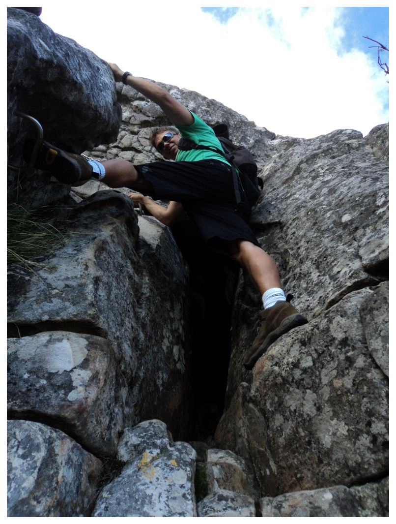 We left from just underneath the Cable Car station at the bottom and headed up on a relatively easy path to the Main Contour Path. There we would make the decision to walk along the contour path to Platteklip Gorge, or to head into the direction of India Venster. Starting time was 8:15 and the pace was not too fast. We were followed by two lady tourist who managed the footpath well with their fancy shoes and tank tops. They eventually turned away to Platteklip Gorg, which is a good idea if you are not protected against the sun. We decided that we are going to try India Venster, despite the warnings that it is not for inexperienced climbers and that navigation is difficult. No Shit Sherlock, that is why I got lost the last time.