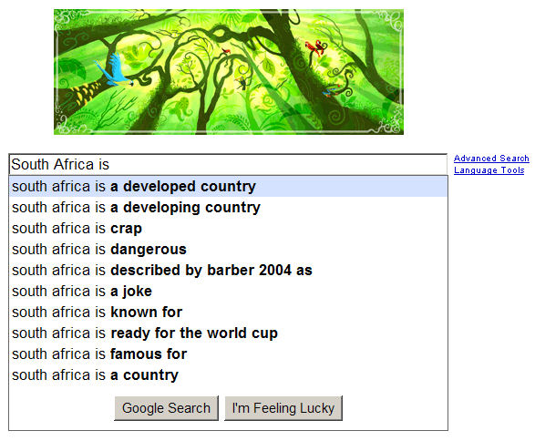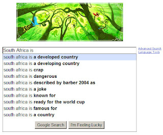Anyway, after seeing that I decided to do a search on South Africa. I have to admit I was expecting results from both sides of the spectrum...and I was not disappointed. South Africans range from complete optimists to complete pessimists. Everyone has his or her own opinion on what's going on in this country, so you can imagine to find positive and negative searches. I am not going to go into detail about the results, it would just be another opinion and open up another debate, but I am glad to see that some people do at least think that South Africa is a developing as well as a developed country. I am also glad to see that people think we are ready for the World Cup. I am more worried if the "World Cup" is ready for us.