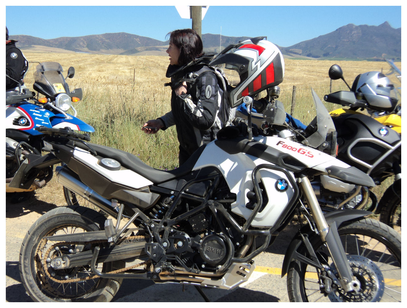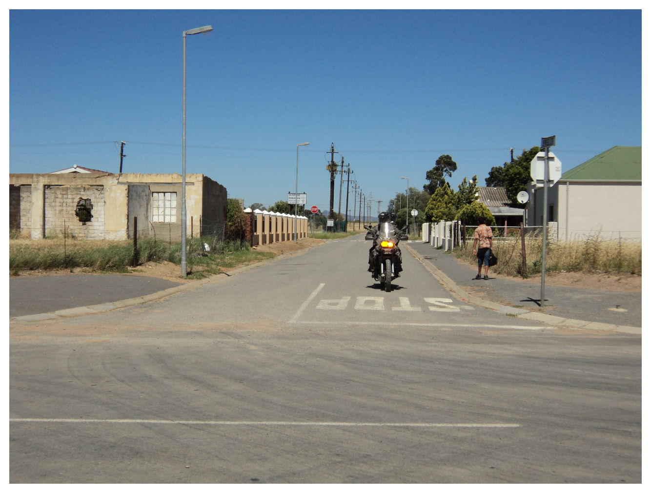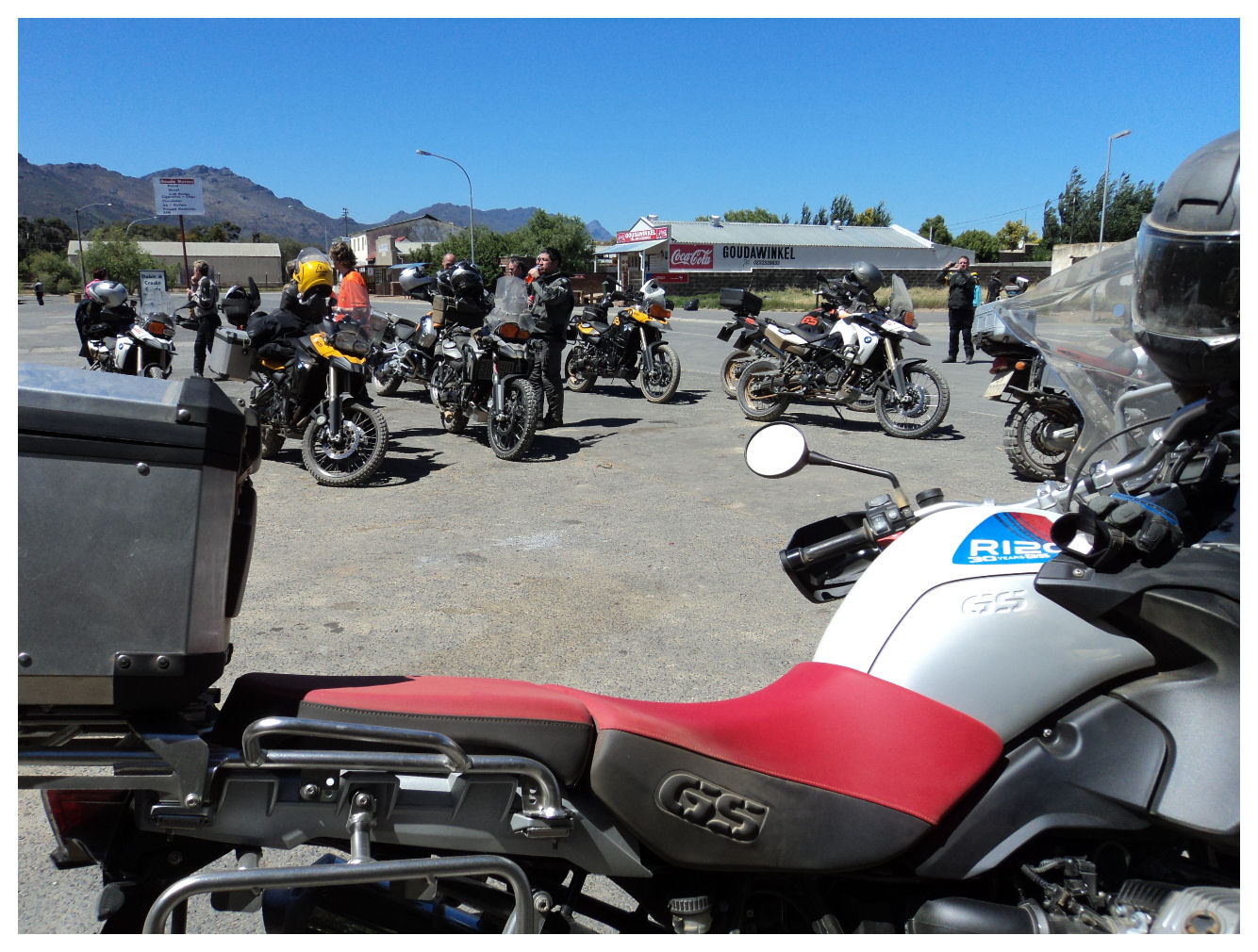 The plan was to have lunch at the Piketberg Spur. Halfway there, we stopped for snacks and water. All I knew was that we had just completed the Porseleinberg Road. And the only thing that led me to that conclusion was an informative road sign with an arrow saying: "Porseleinberg". When I opened my top box to take out my water, I discovered that I had no more water left. Just wet car keys, remotes, soaked spare gloves, and other insignificant goodies that fortunately could not get damaged by a water-filled top box that had just turned into a trendy wishy-washy . Fortunately my beef sandwiches inside a well-sealed plastic container survived, so I finished them off before the remaining wishy-washy cycle could do that for me. Joan*, a friendly pillion, offered me some water from her bottle. I made the mistake of leaving my banana there "for later", a discovery I made only as I arrived home. It was getting rather hot, 27 degrees, but while riding the heat was bearable. At this point I was completely lost. I knew we just passed Porseleinberg, but I had no idea where in South Africa Porseleinberg was. And I knew we were heading towards Piketberg, but on which road I did not know either. We took some more farm roads and when we reached civilization again we were actually riding into a small settlement called Gouda. Not that Gouda could be described as "civilization", but there was a shop and on a Sunday afternoon it was surprizingly very much "buzzing with activity". Some of us had more refreshments and we all agreed that despite the dust, we were all having loads of fun.