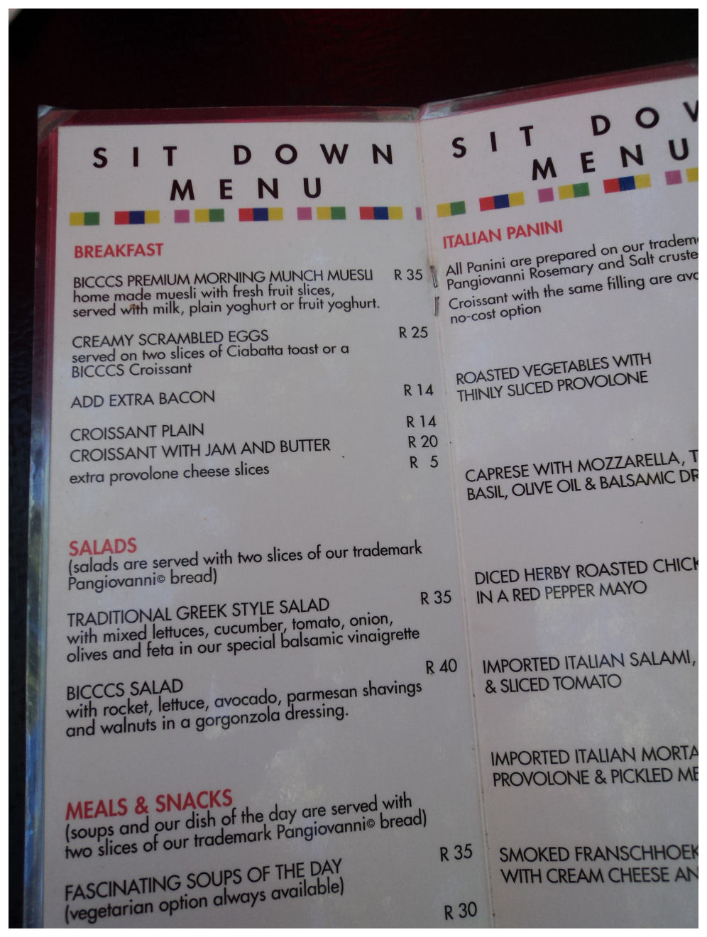 There's not much to choose from". At least I know now what "BICCCS" stands for, but believe me, the place did not make the cut at all. Which brings me to my next question. "Who does EAT OUT write reviews for? Is it for people who wants to think they have style and only eat at restaurants with "ambiance", or for plain fools who believe everything they read? But hey, why would anyone value MY opinion? Go check it out for yourself. You don't have to bypass this restaurant on your next trip to Franschhoek. If you actually like the place then you are one of the many people who have actually given this lousy menu a 5-star rating. Maybe I just don't have style and don't appreciate "ambiance", but at least I know when someone is taking me for a ride....and next time when I am in Franschhoek I will definitely ride past and try the next restaurant.