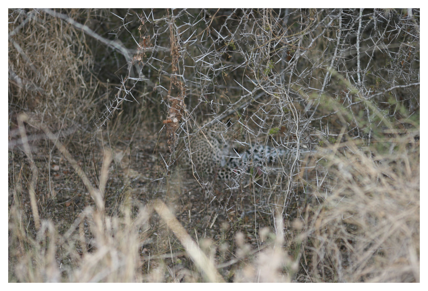 My father-in-law felt that with still 90 minutes to go before the gates close, there was still enough time to go search for more animals. I joined him and we did a small circle route aiming to be back in the camp just before 5:30 when the gate closes. The sun was already starting to set and even though we weren't expecting to see much, we were quite amazed by what one still could see in such a short time; a couple of elephants from very close-up, baboons, Kudu, Impala, Waterbuck, Warthogs....and yes, we even saw more lions. On our way back, 3 kilometres from the gate and 7 minutes before it closes, something weird and wonderful happened. Another leopard was lying on the side of the road, hidden behind a thorn bush. It was just unbelievable. Not only did I manage to see three cheetahs in three days, but also three leopards. I tried to take a picture but my zoom lens made it very difficult as it was focusing on the grass and thorn bush branches instead of on the leopard. I realized that I still have to work on my manual focusing skills, but there was no time to start working on that now as the gate was about to close and we had to get there as soon as possible. I managed to get proof at least.