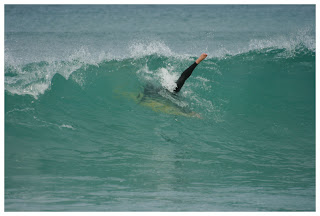 I have been surfing for nearly 30 years now and I realized the other day that I don't have ANY pictures of me actually surfing. I guess it is probably because I have no friends that have waterproof cameras or cameras with lenses long enough to reach the backline. This morning while having breakfast at a restaurant overlooking Blouberg Beach, I noticed that despite the waves being very small, that they are breaking close to the beach. Close enough to take a picture I thought. Knowing that I have a lens that might just make me visible on the picture, I decided to have a quick session and asked my wife to play photographer. She hates that job because she says I am never happy with the end results of anything she has taken in the past, but that is not entirely true. I have one or two pictures that she has taken of me that are good, but none of them in the water unfortunately. The waves on the other hand was not really picture quality waves either and the few times I managed to get up on the lazy ice cold waves, she was either running after my son on the beach or the wave had closed out before she could get the focus right. What she did manage to do though was to take a good picture of a perfectly executed duck dive which I might blow up and post on my wall some day. One might think that after 30 years of surfing that I could get a better wave than the one below, but sadly that is all the Atlantic Ocean had on offer today. But even though she might not think that I appreciate her efforts, at least I have one picture of me surfing and that means a lot. I think I will try Outer Pool in Mossel Bay next time, there she can sit on the rocks and fire away. Watch this space.